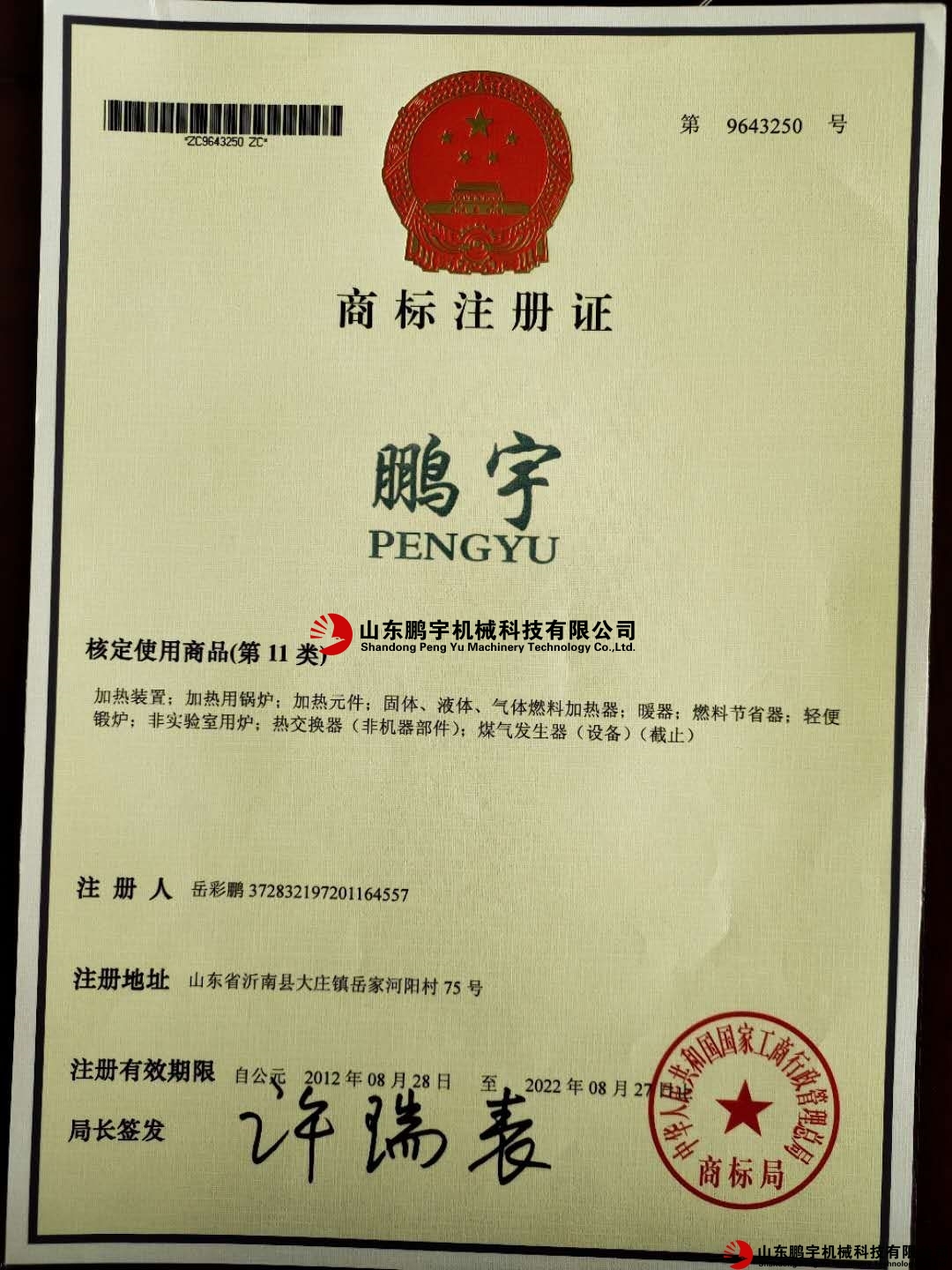 鵬宇鍋爐商標(biāo)注冊(cè)完成
