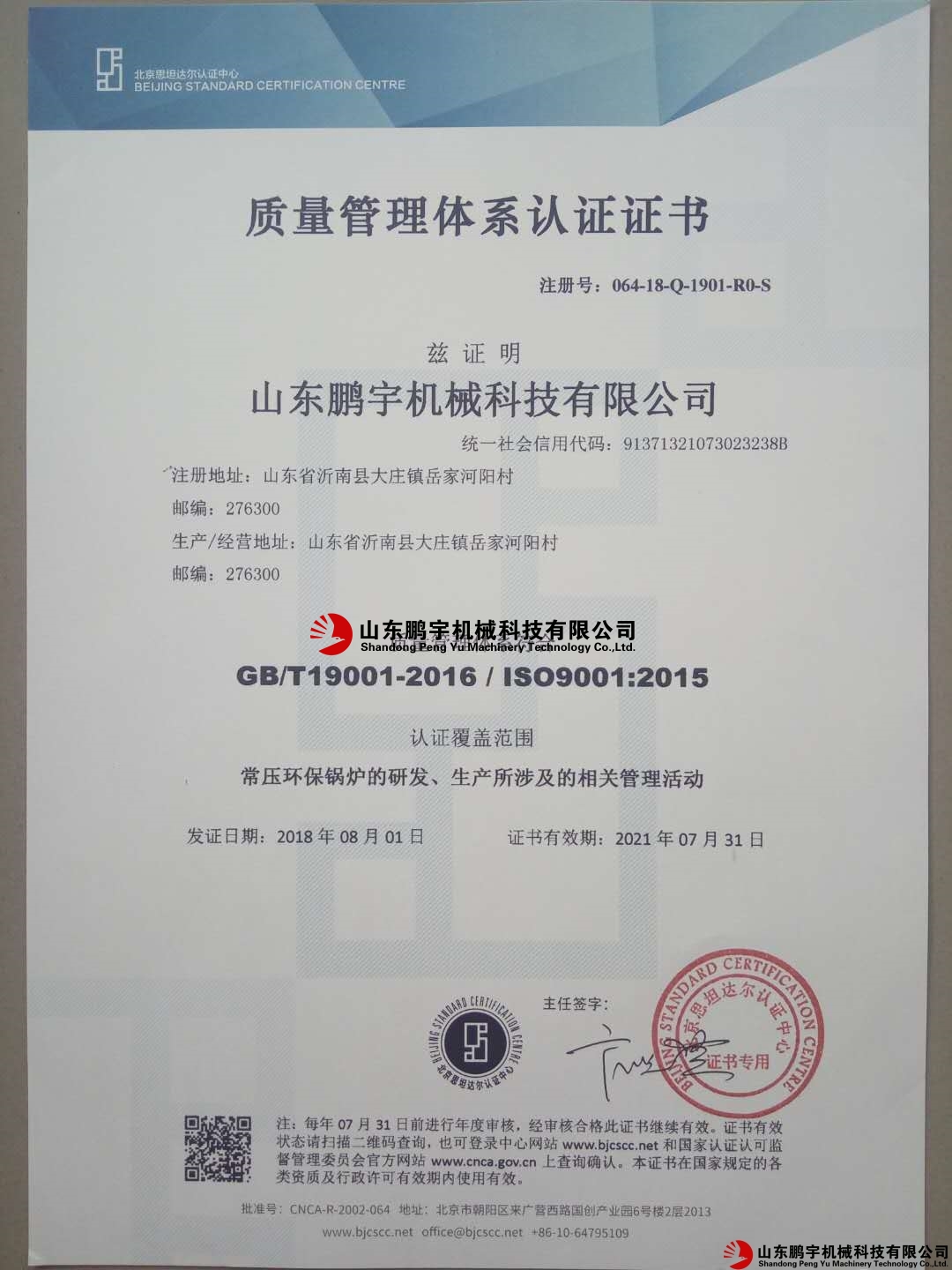 公司更名為山東鵬宇鍋爐有限公司