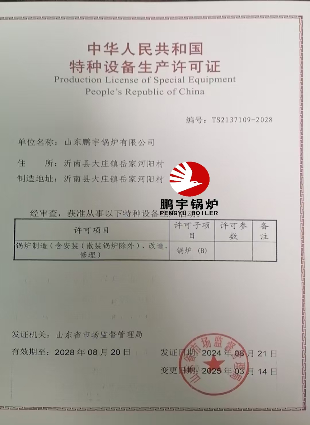 取得鍋爐B級(jí)特種設(shè)備生產(chǎn)許可證